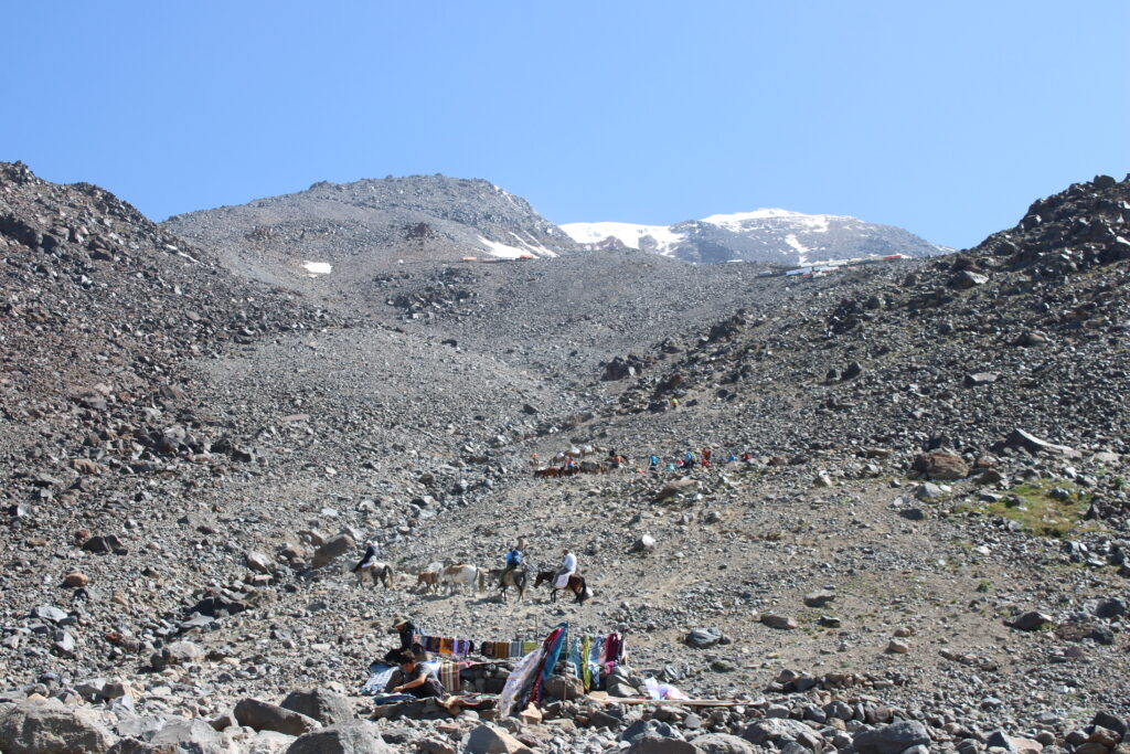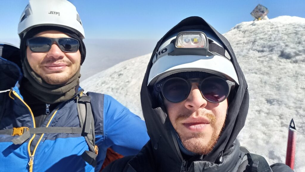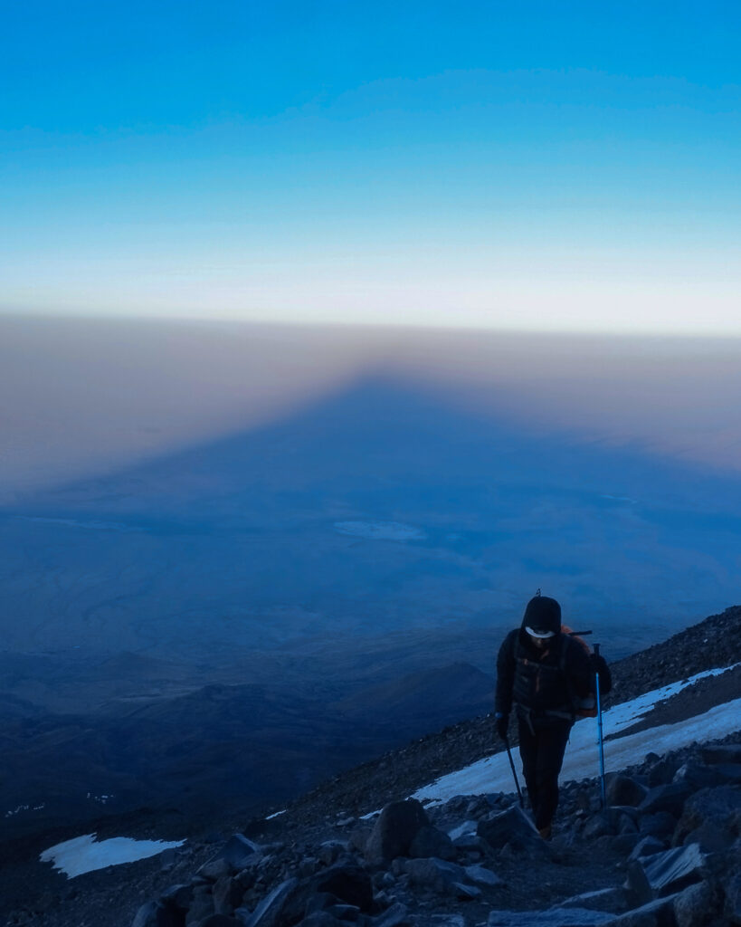 Rehberler en geç 02.00’da yola çıkmamızı tavsiye ettiler ama biz patikayı daha rahat bulmak adına gün doğumuna yakın yola çıkmaya karar verdik ve 04.00 civarında zirve yürüyüşüne başladık. Başladığımız andan itibaren rüzgâr kendisini hissettiriyordu, Dağ Geçidi’nden sonrasında açıkta kaldığımız için rüzgâr çok daha fazla etki etmeye başlamışken güneş de direkt yüzümüze vurunca neden daha erken çıkmamız gerektiğini anladık. İkimizde de rüzgârdan fena bir baş ağrısı başladığı için sık sık mola verip dinlendik.Dağ geçidinden sonra yer yer buzlanmalara dikkat etmek gerekiyor, birkaç kere fark etmeden basıp ayağımın kaydığı yerler hatırlıyorum.